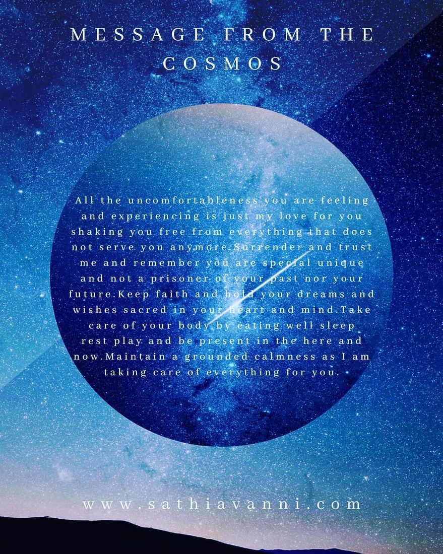 All the uncomfortableness you are feeling and experiencing is just my love for you shaking you free from everything that does not serve you anymore. Surrender and trust me and remember you are special unique and not a prisoner of your past nor your future. Keep the faith and hold your dreams and wishes sacred in your heart and mind. Take care of your body by eating well sleep rest play and be present in the here and now. Maintain a grounded calmness as I am taking care of everything for you